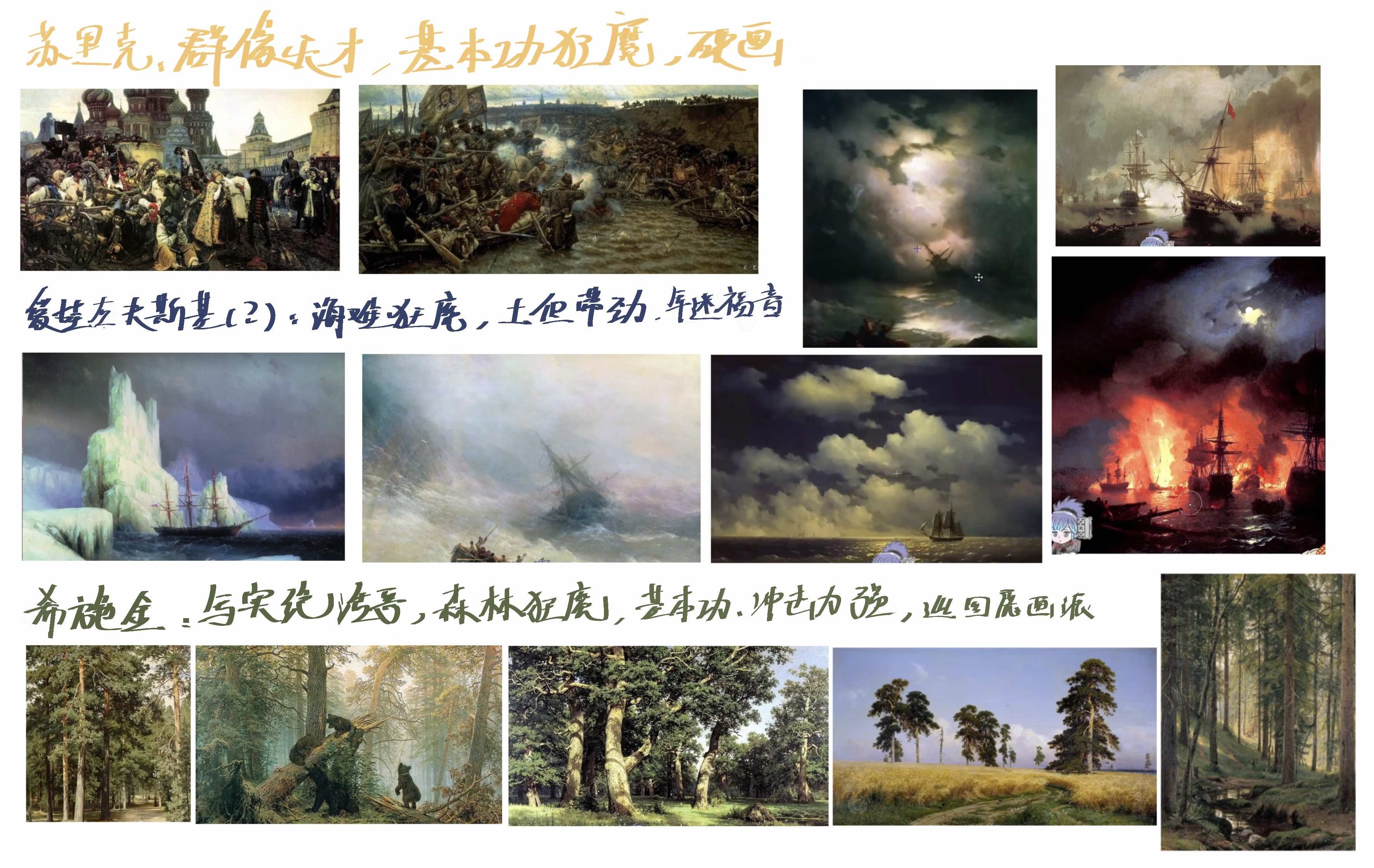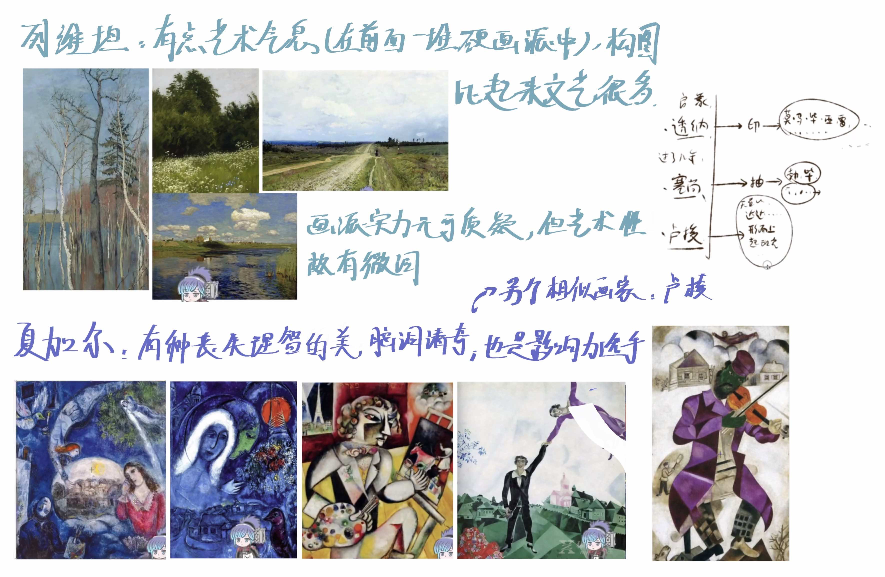 苏里科夫(Vasily Surikov)、埃瓦佐夫斯基(Ivan Aivazovsky)、希施金(Ivan Shishkin)列维坦(Isaac Levitan)、俄式抽象-夏加尔(Marc Chagall)